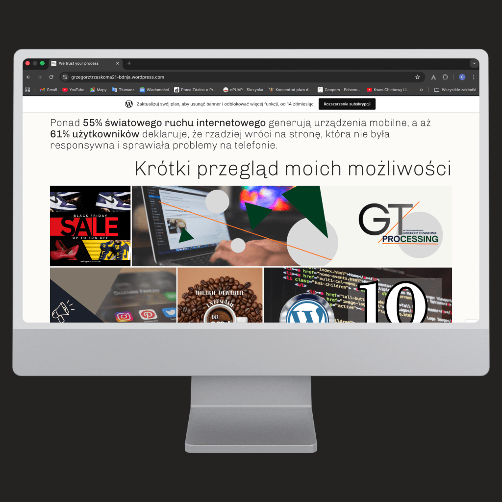 Tworzenie stron bez dramatu. Projektuje profesjonalne, nowoczesne strony internetowe oparte na WordPressie bez zbędnego przepłacania i skomplikowanych systemów. Jeśli potrzebujesz nowoczesnych grafik do swojej witryny lub na social media wykorzystuję Canvę, by dostarczyć spójne i dopracowane materiały.
